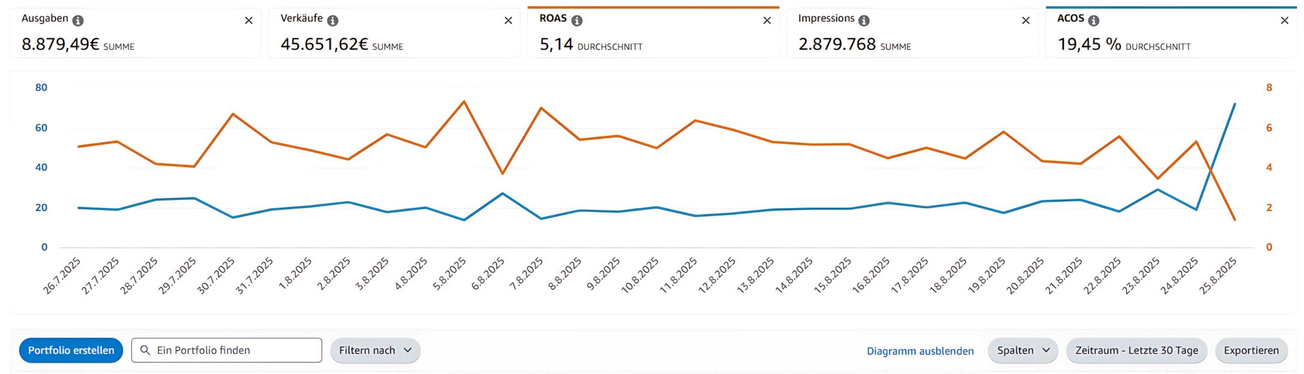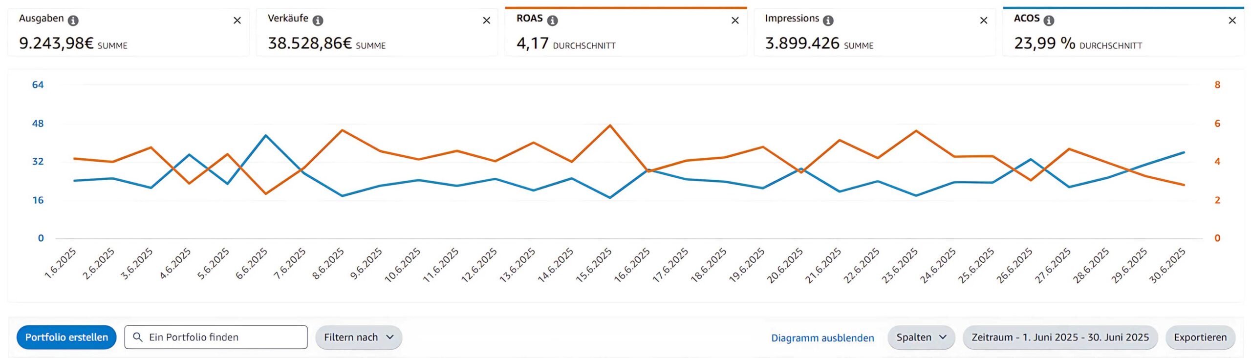 Dieser anonymisierte Kunde war überzeugt, seine Kampagnen liefen bereits „gut genug“. Mit fast 9.300 € Monatsausgaben und einem ACOS von knapp 24 % fühlte er sich sicher.